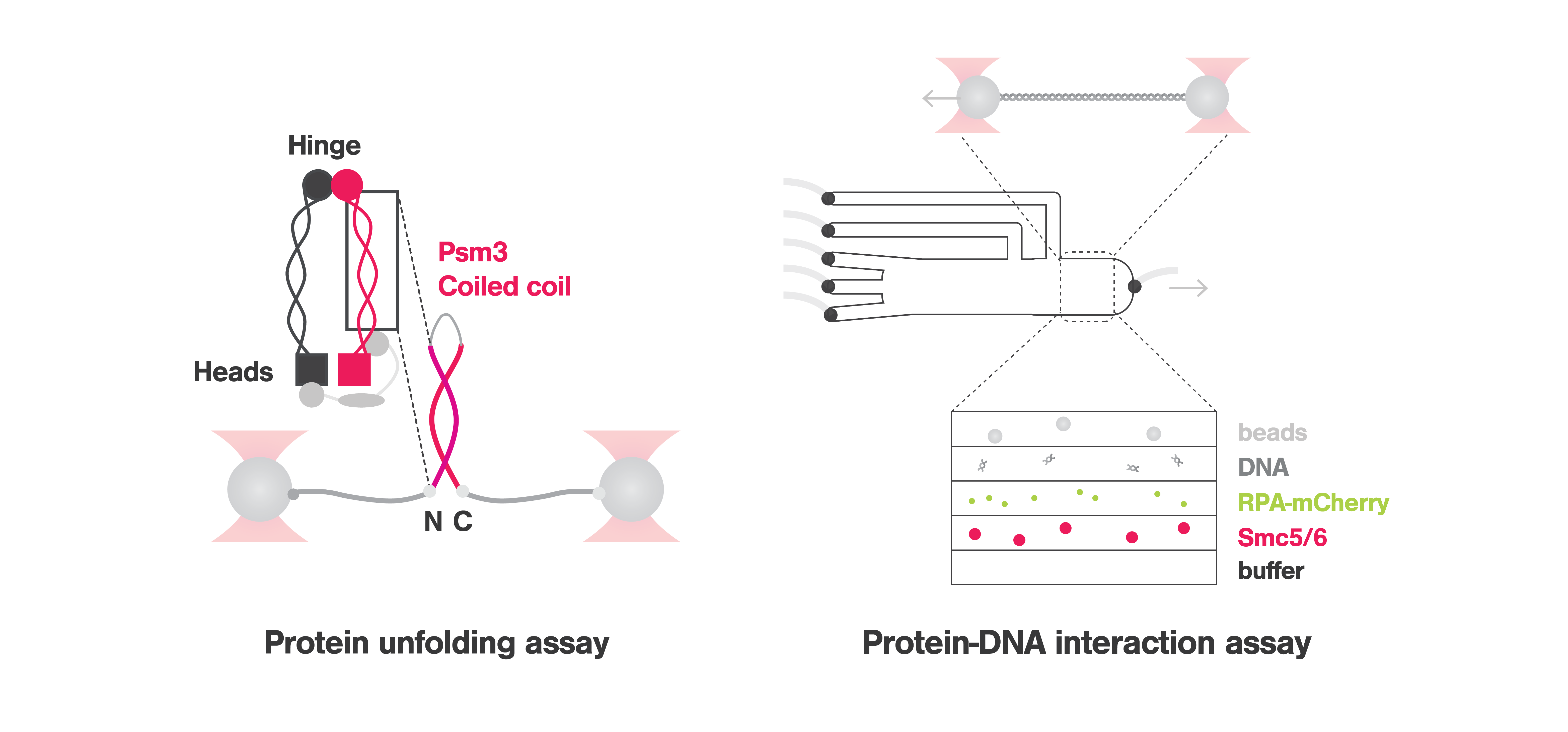 To understand the mechanism by which SMC Complexes are recruited to and interact with DNA, Nicoleta-Loredana Tanasie and colleagues studied Smc5/6, a member of the SMC family that has been linked to replication fork-related processes to understand how this protein is recruited to DNA lesions. Using the C-Trap that combines optical tweezers, confocal microscopy and microfluidics with multiple laminar flow channels, the researchers used a hybrid ssDNA-dsDNA that mimicked the replication fork and fluorescently labelled the ssDNA for visualization. These experiments highlighted that Smc5/6 is enriched to ssDNA and ssDNA-dsDNA junctions while it is depleted at dsDNA fragments. Further tests proved that Smc5/6 scans the dsDNA in a 1D diffusion fashion and stops when it reaches the fork junction. Moreover, varying the distance between the trapped beads to create tension on the DNA filaments, confirms that Smc5/6 stabilizes ssDNA-dsDNA fork junctions.
