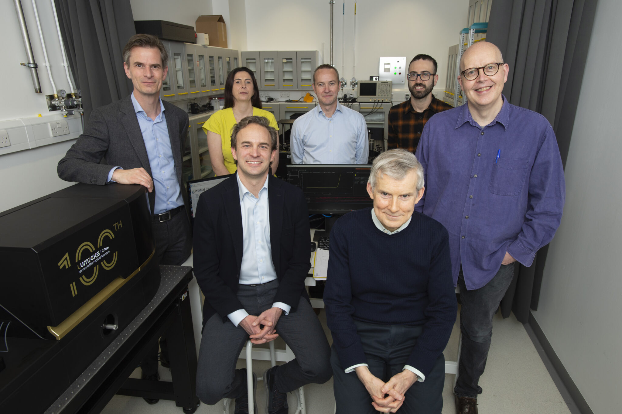 100th C-Trap installation with Dr. David Barford and Dr. Stephen McLaughin from the MRC-LMB and Dr. Paul Wheeler, Dr. Andrea Candelli, Dr. Jos Maas and Rosemary Sales from LUMICKS. Image credit: MRC Laboratory of Molecular Biology.