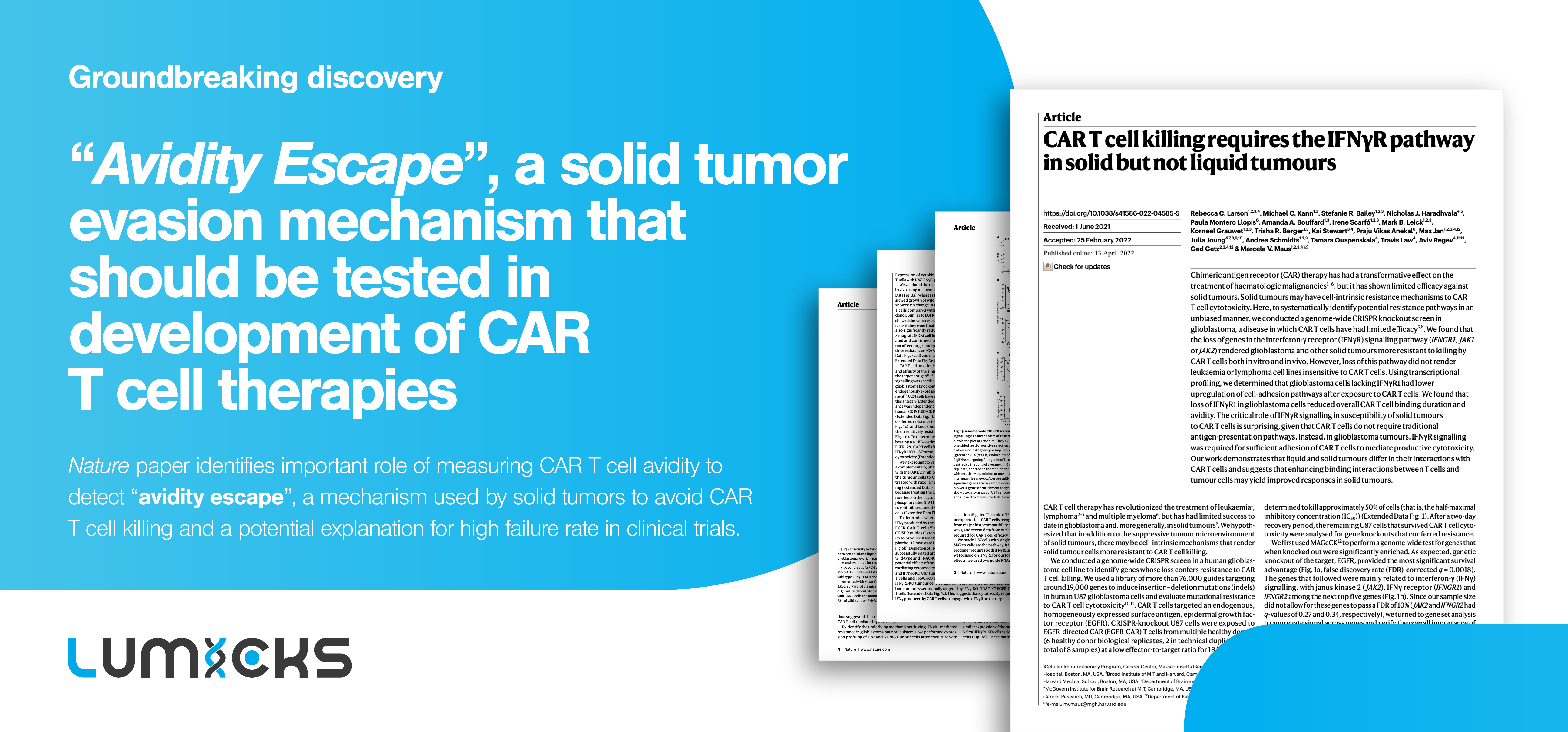 The study demonstrates the power of LUMICKS’ z-Movi® Cell Avidity Analyzer to measure cell avidity, a crucial biomarker for understanding immune cell function and for providing superior predictive information of therapeutic efficacy. The Nature paper (April 16, 2022), entitled “CAR T cell killing requires the IFNγR pathway in solid but not liquid tumors” was published by a pioneering team of chimeric antigen receptor (CAR) T cell researchers led by Dr. Marcela V. Maus, Associate Professor of Medicine at Harvard Medical School and Director of the Cellular Immunotherapy Program at Massachusetts General Hospital.
