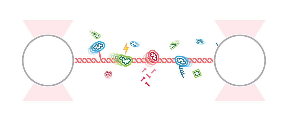 In this paper, scientists at the MRC London Institute of Medical Sciences and AstraZeneca studied how CRISPR-Cas9 differentiates between on-targets and off-targets. They used the C-Trap® optical tweezers – fluorescence microscope to monitor fluorescently labeled Cas9 complex binding to λ-DNA in real time. Their data showed that, while Cas9 binds on-target sites tightly and specifically on DNA that is loose and relaxed, stretching the DNA by increasing the tension induces reversible off-target binding at multiple sites. They found that these off-target binding events are driven by mechanical distortion of the DNA – such as the formation of DNA bubbles – and are guide-RNA-sequence dependent. These results suggest that DNA destabilization during cellular processes, such as transcription or replication, can express off-targets to Cas9 activity.