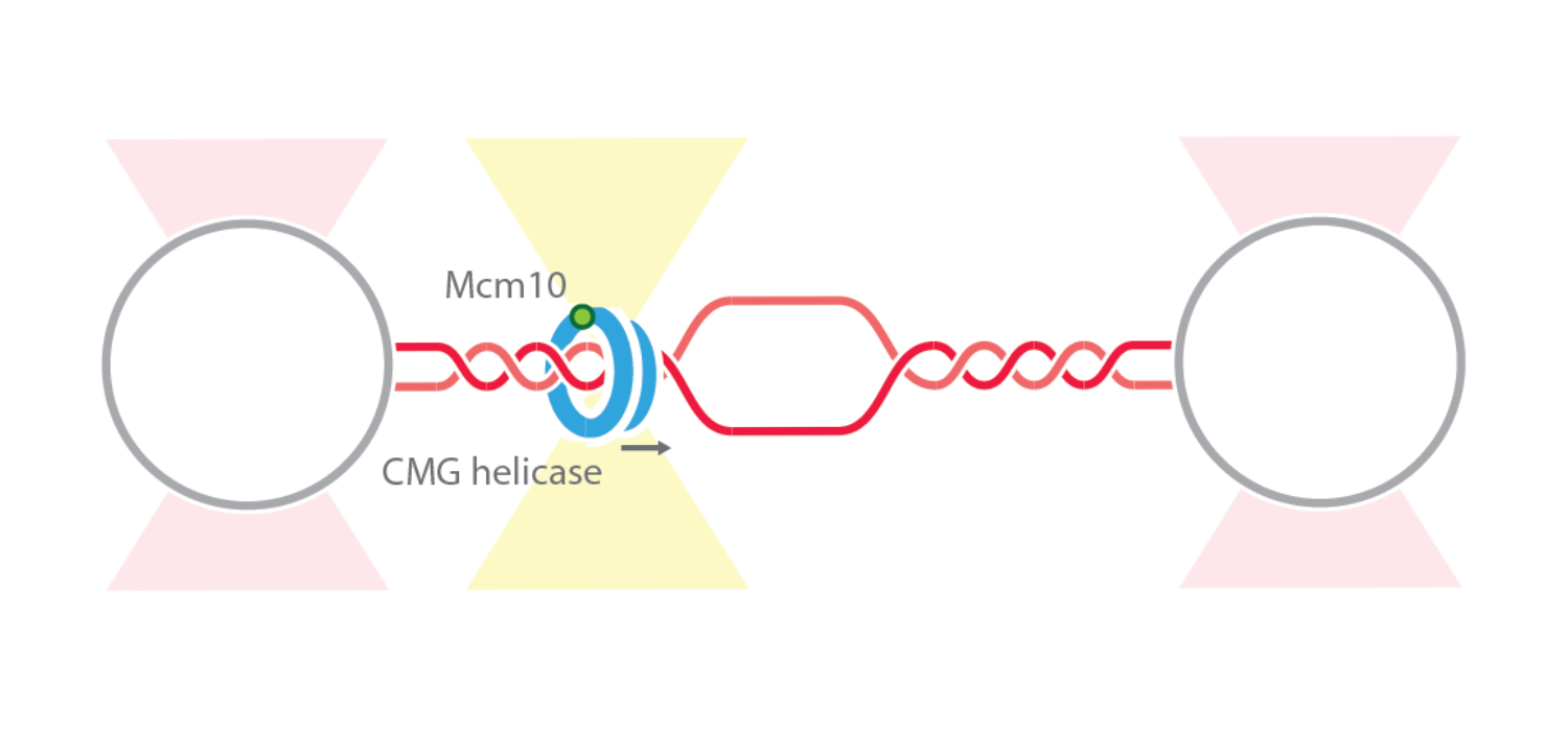 Wasserman et al. analyzed the properties of fluorescently-labeled CMG during DNA replication. For this, they used optical tweezers to tether a double-stranded molecule between two beads and create DNA forks in situ by force manipulation. They then visualized the behavior of single CMG complexes using fluorescence imaging while subjecting the replisome assembly to different reaction conditions by utilizing the laminar flow microfluidics.