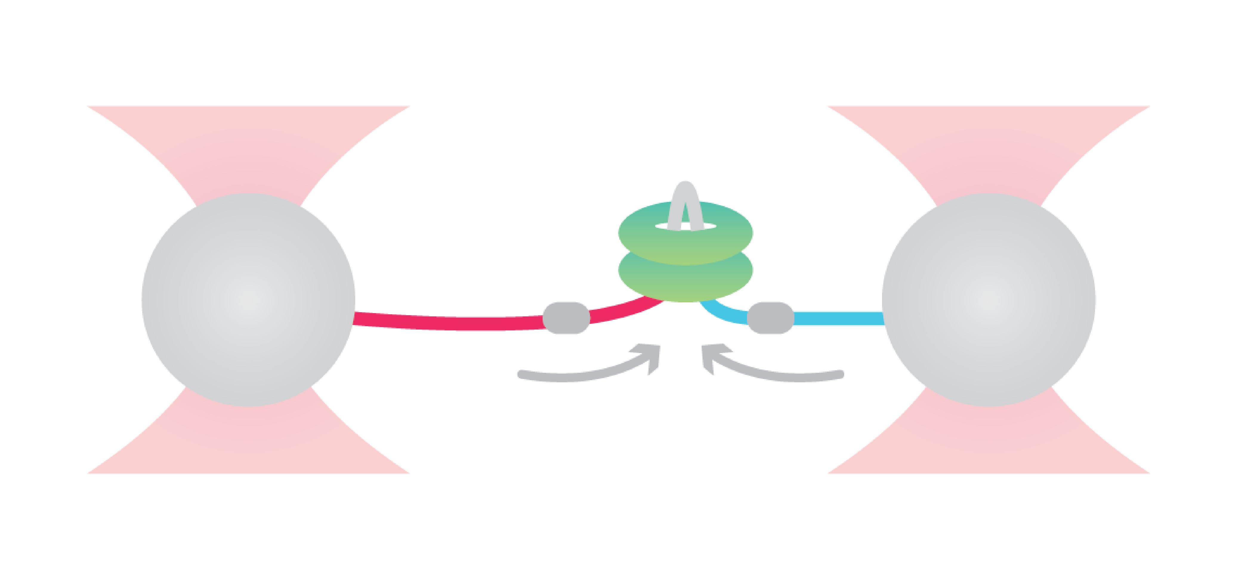 The researchers first tethered the bacterial maltose-binding protein (MBP) between two optically trapped beads through DNA handles. Next, they introduced a fluorescently labeled ClpB and assessed distance-changes between the two MBP-termini upon translocation.