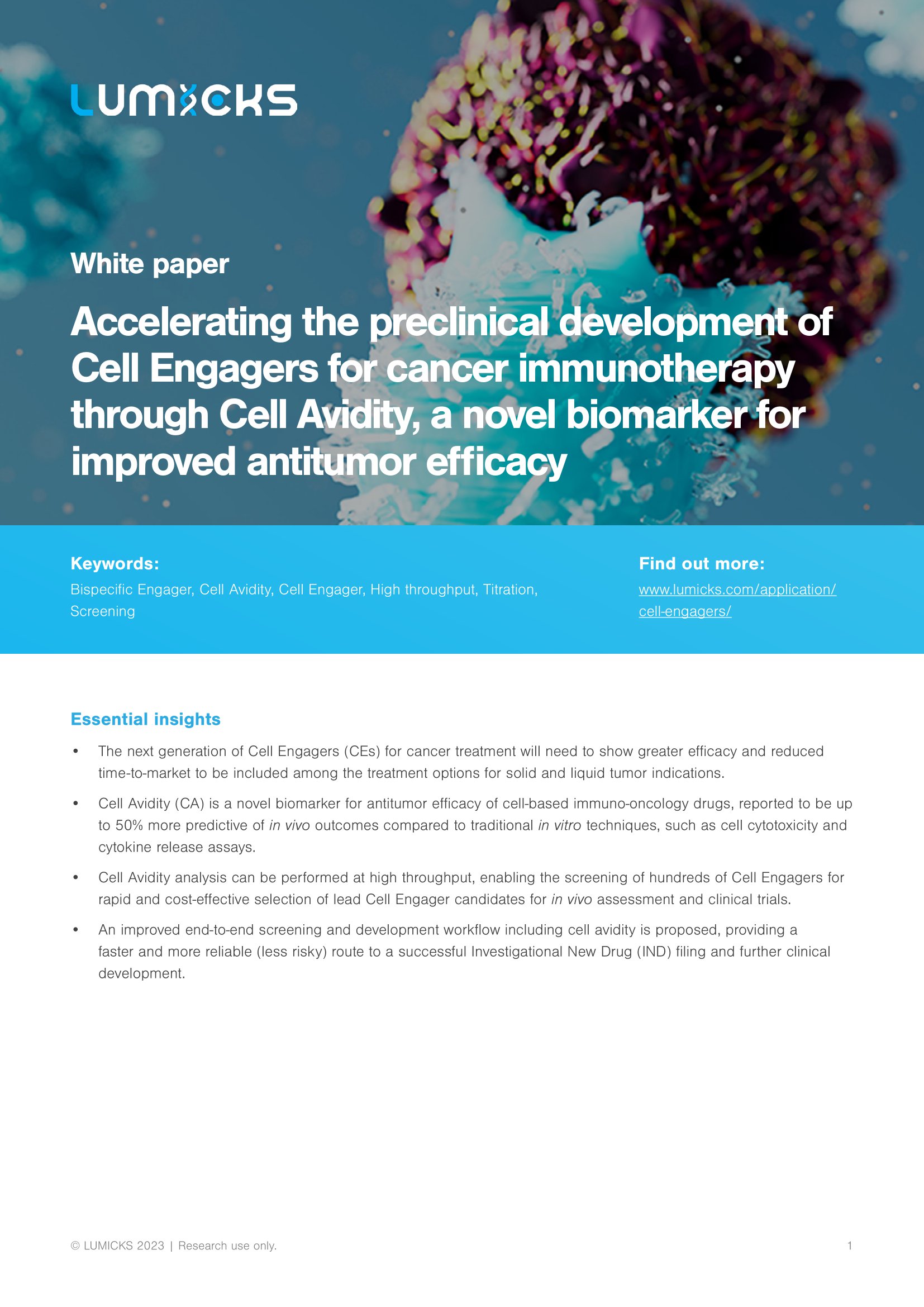 In this white paper, we discuss how cell engagers could overcome challenges presented by current CAR-T therapies and how the new LUMICKS high throughput service platform can measure hundreds of cell engagers for rapid and cost-effective selection of the most potent cell engagers.